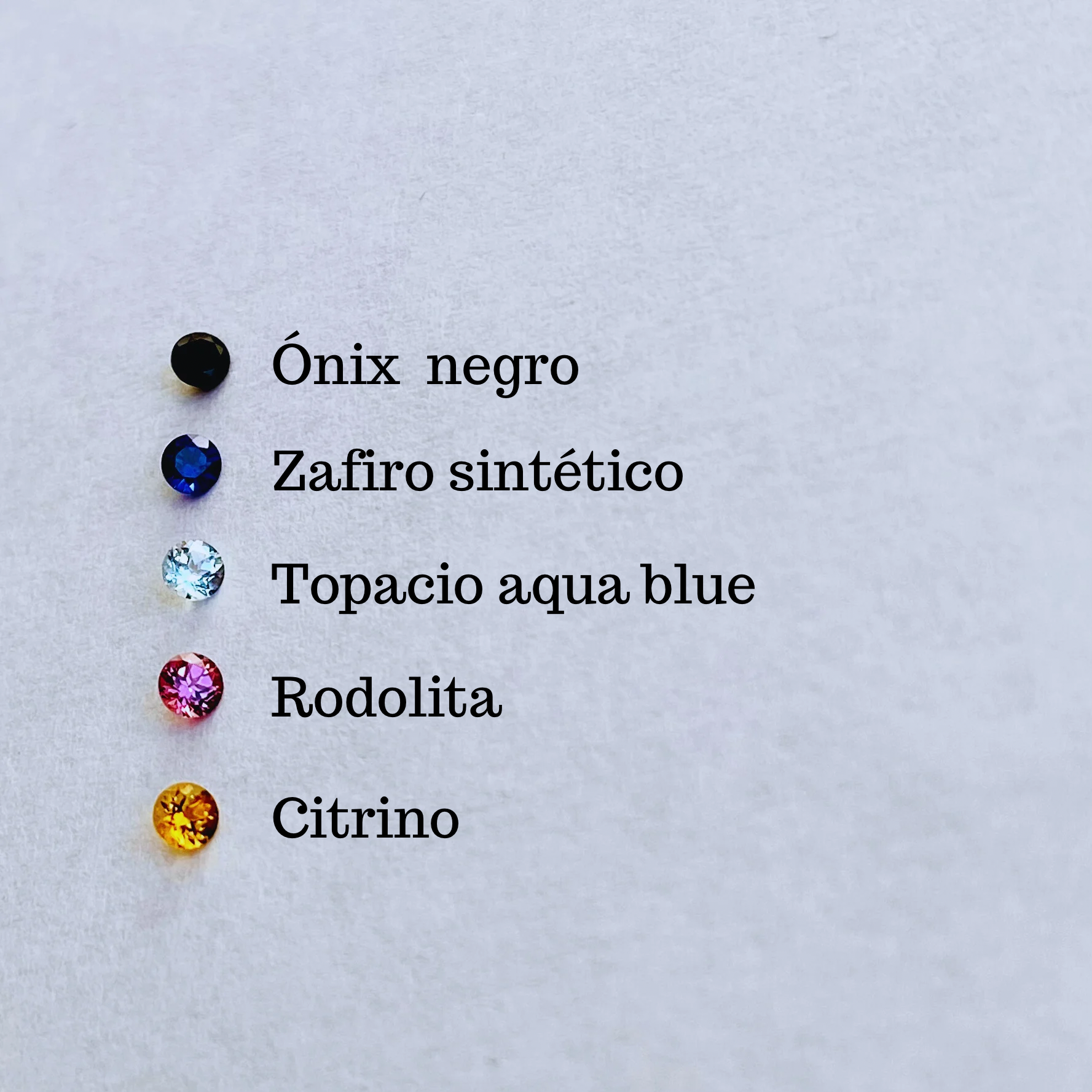 Los valores podrían variar dependiendo del color que se elija. Los cristales Swarovski (CS) son sintéticos y las piedras son naturales (salvo el zafiro, que es sintetizado en laboratorio).