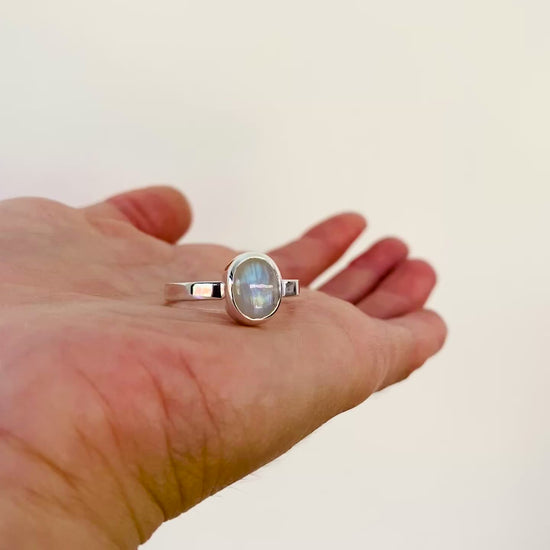Anillo con engaste en bisel y piedra luna corte cabuchón de 10 x 8 mm aprox. Argolla cuadrada, terminación brillante.