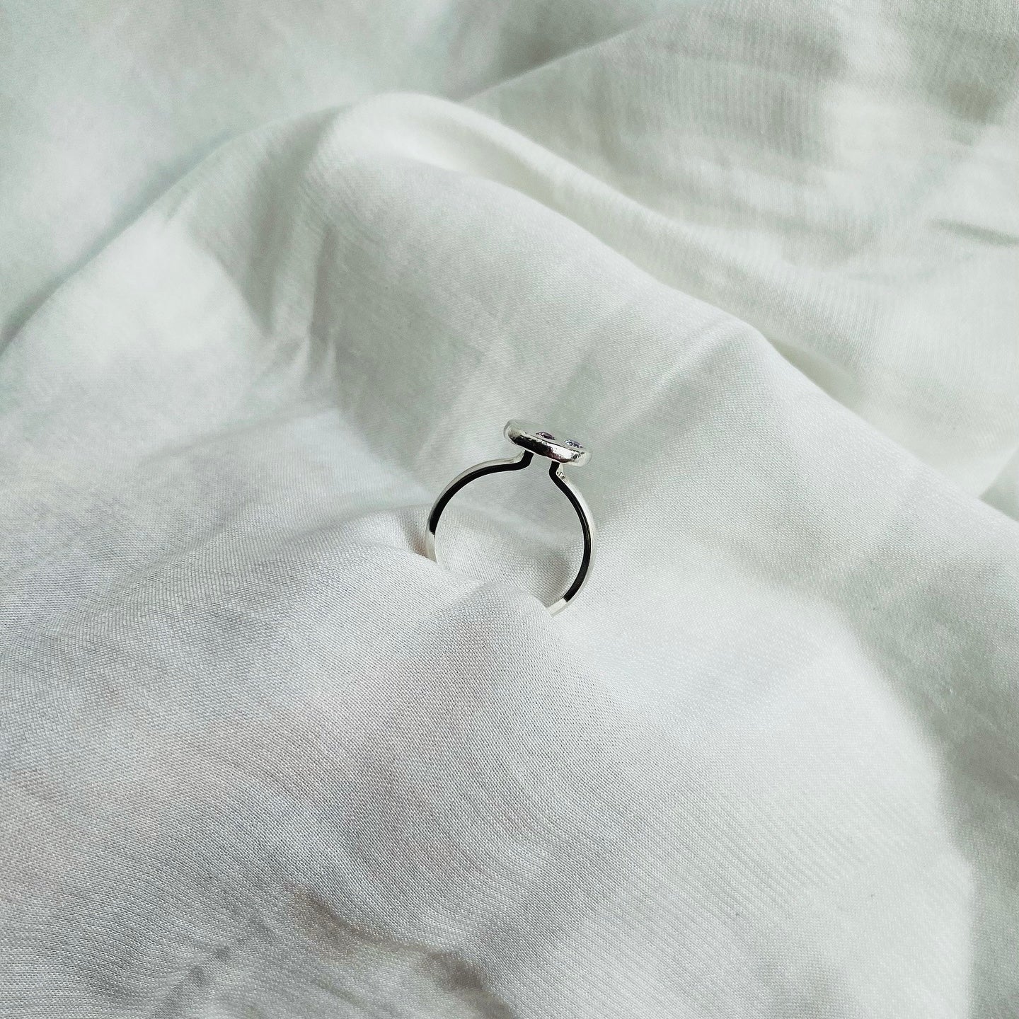 Anillo con ovalo elevado (permite uso de argollas y otros anillos simples en el mismo dedo), efecto rústico y 2 Cristales Swarovski (morado y lavanda) de 2,0 mm en engaste invisible.