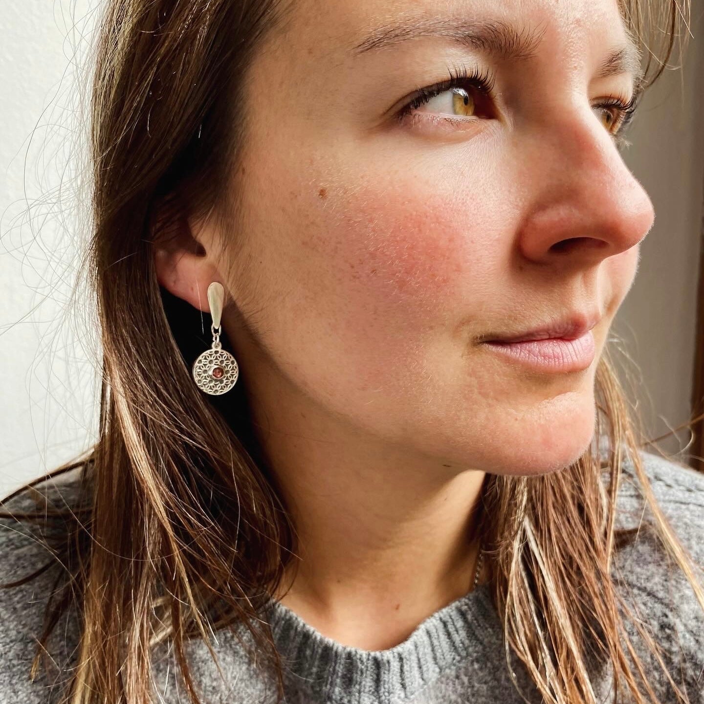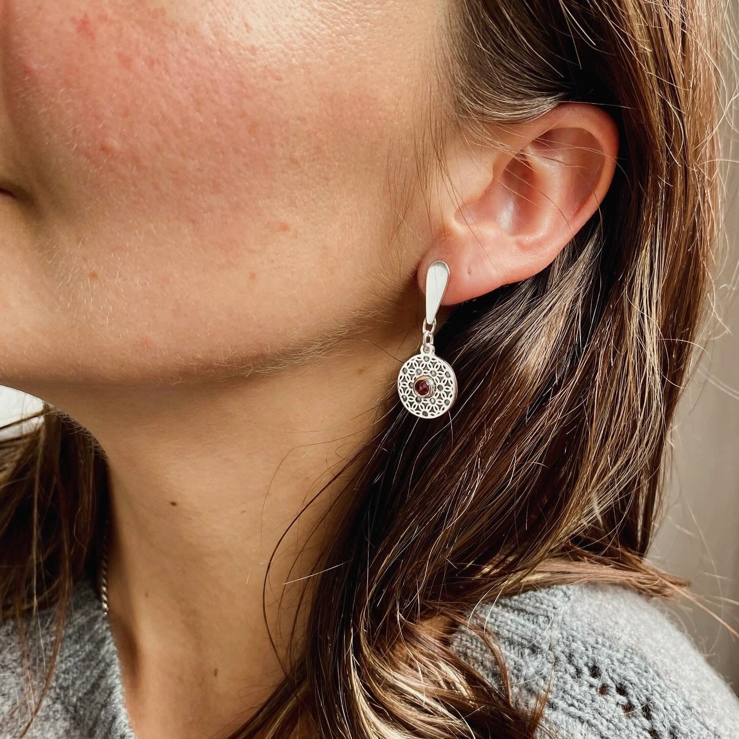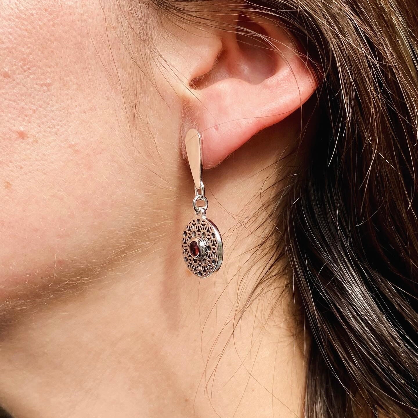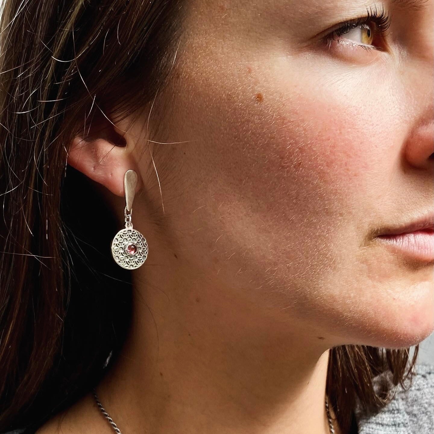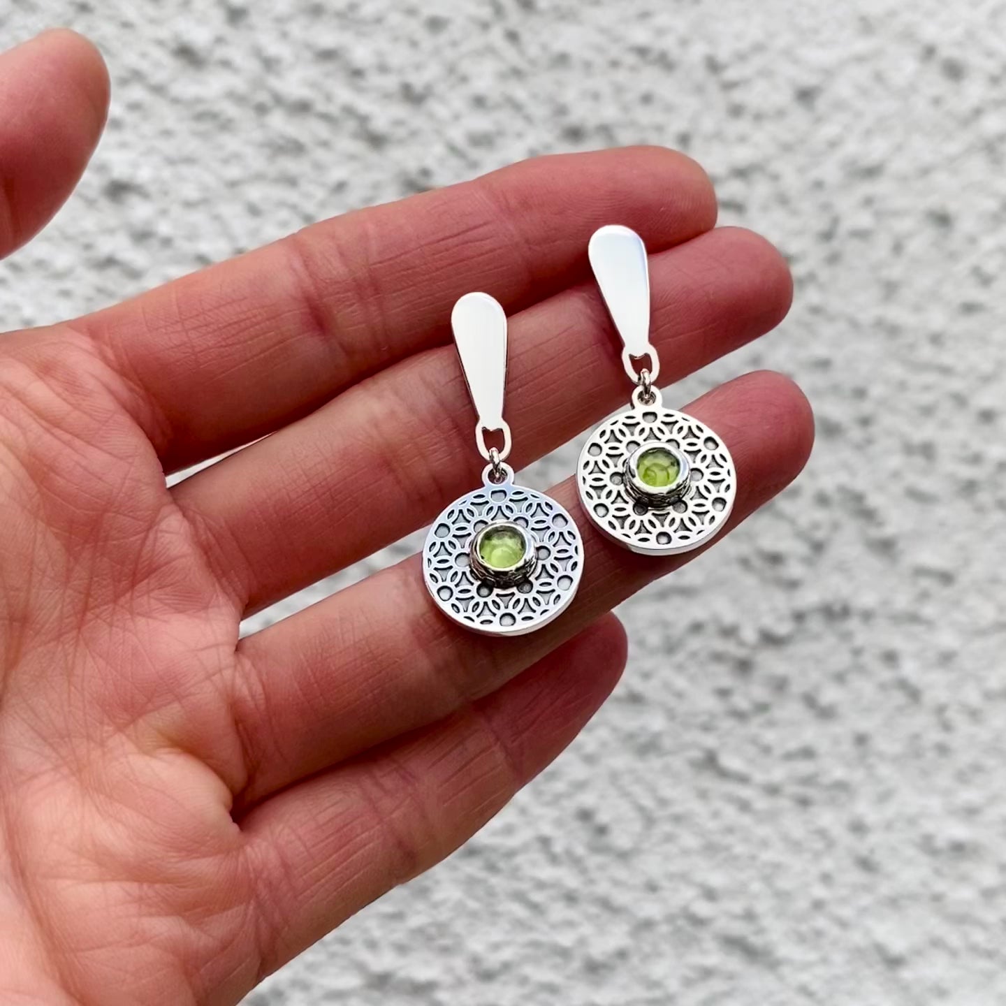 Par de aros móviles con mandala de flor de la vida y piedra natural a elección (turmalina rosada o peridoto) redonda en corte cabuchón.