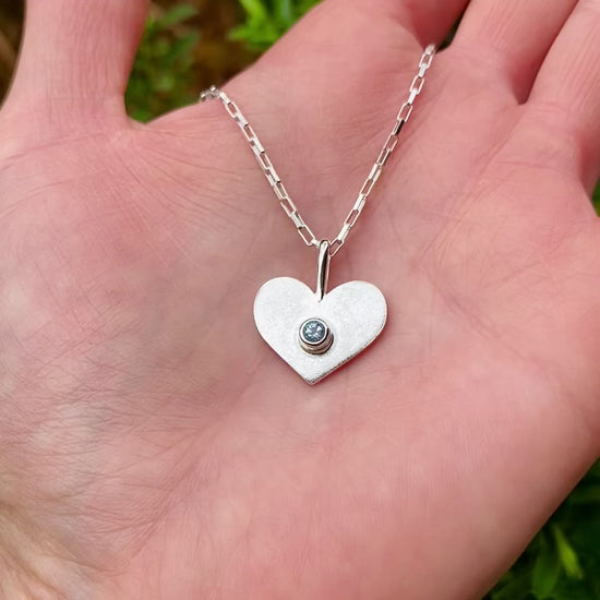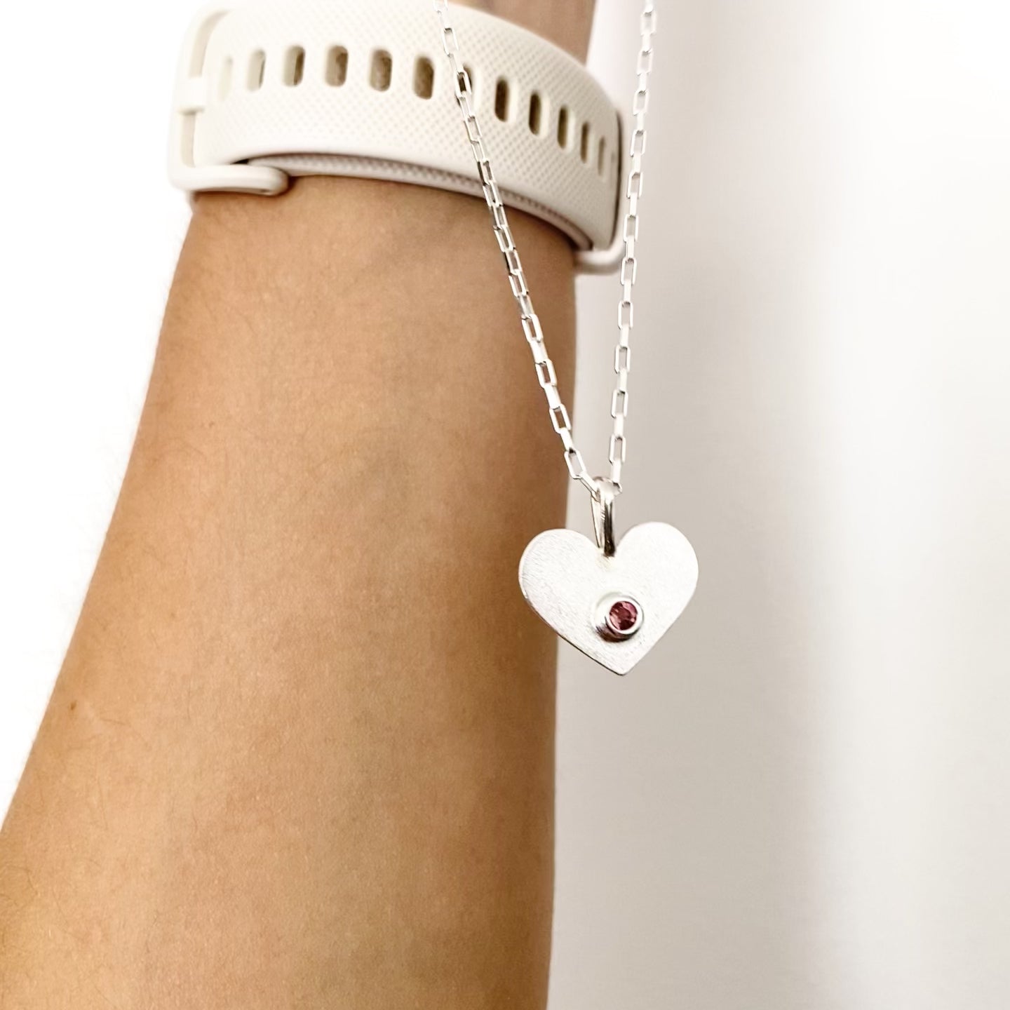 Colgante en forma de corazón calado con piedra turmalina rubelita o topacio de 3 mm de diámetro en corte brillante. Engaste de tubo. Terminación diamantada brillante.