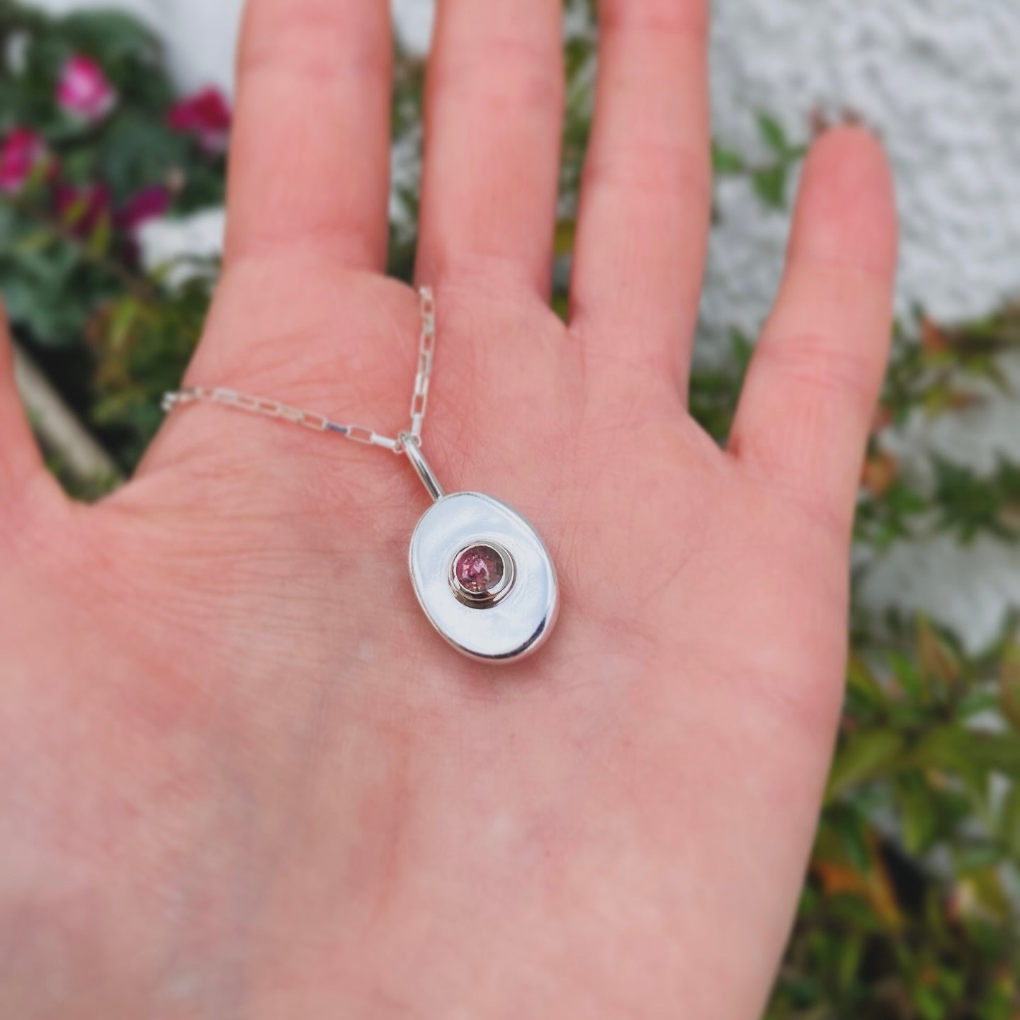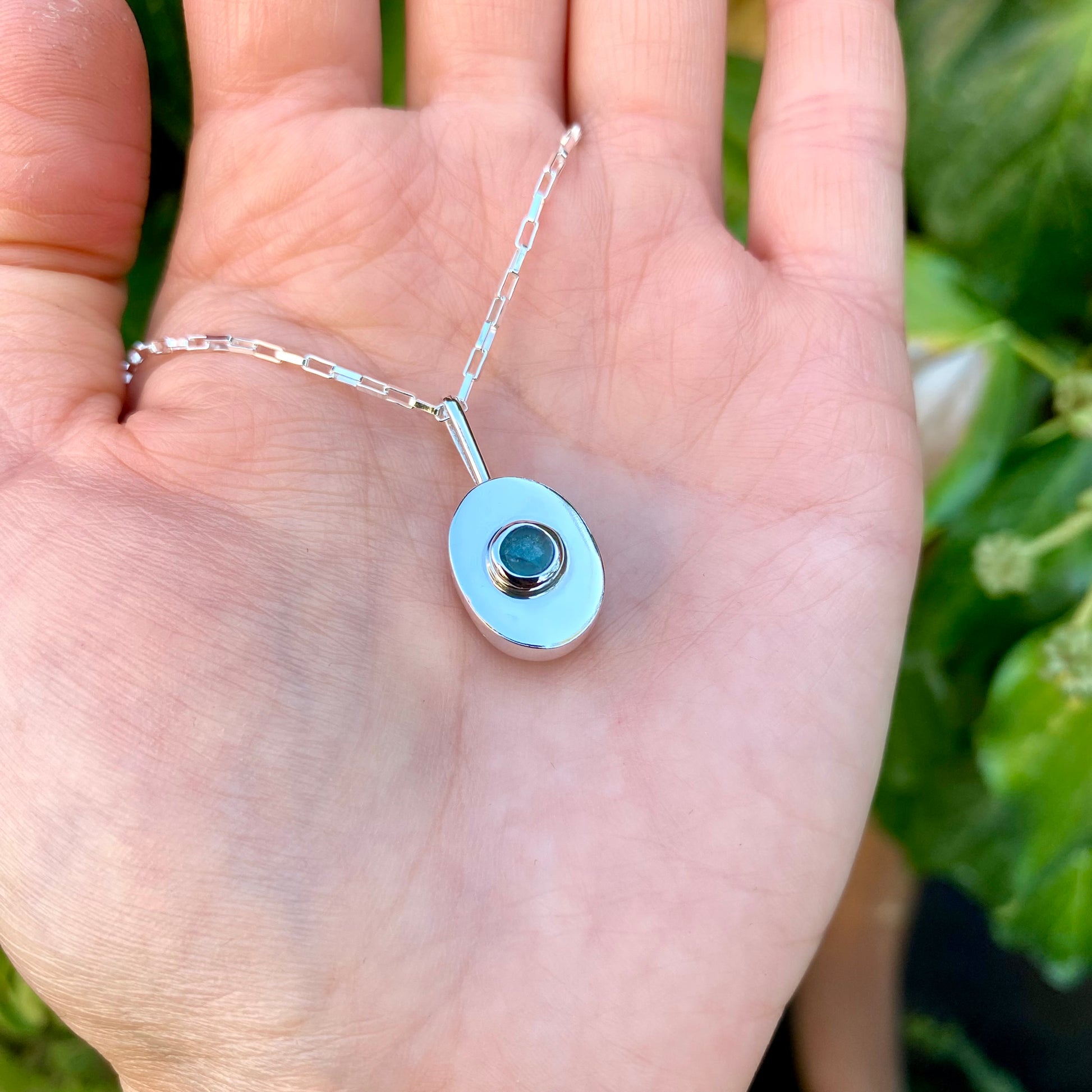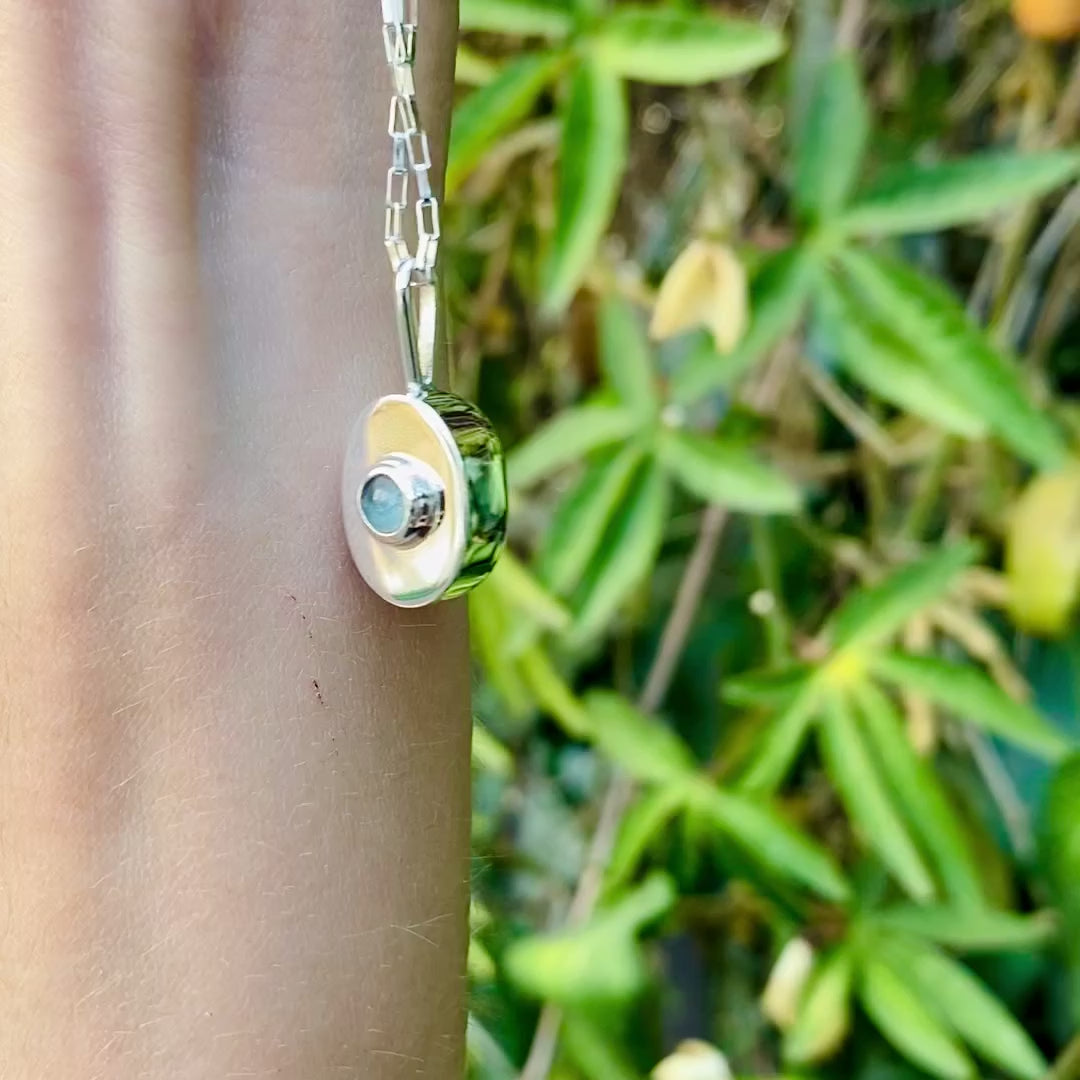 Colgante dos en uno, reversible. Por un lado tiene una piedra en corte cabuchón grande y por el otro una piedra en corte cabuchón pequeña, centrada en una base de plata. Terminación brillante.