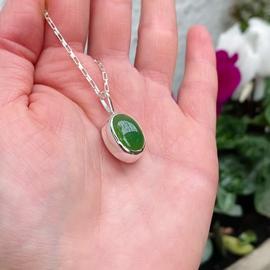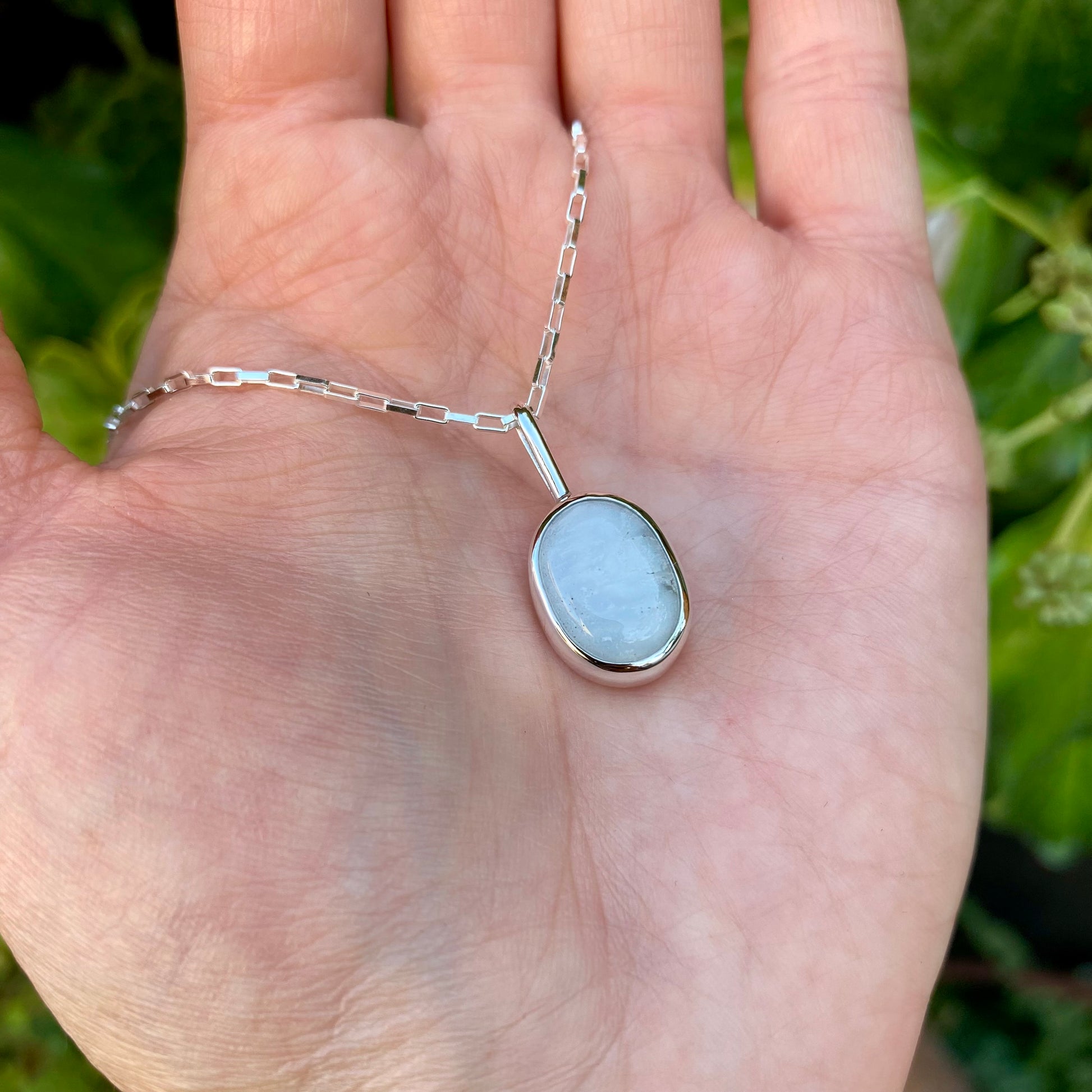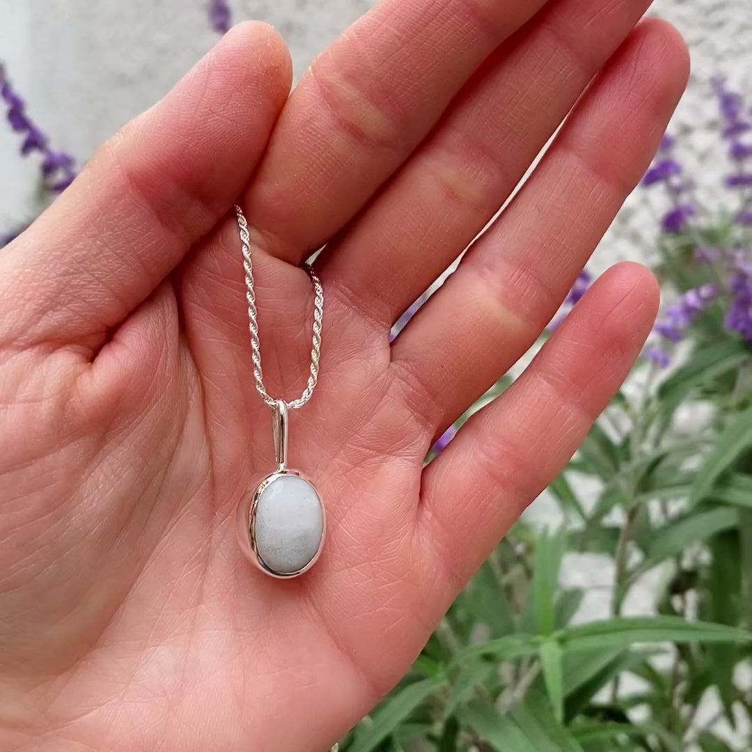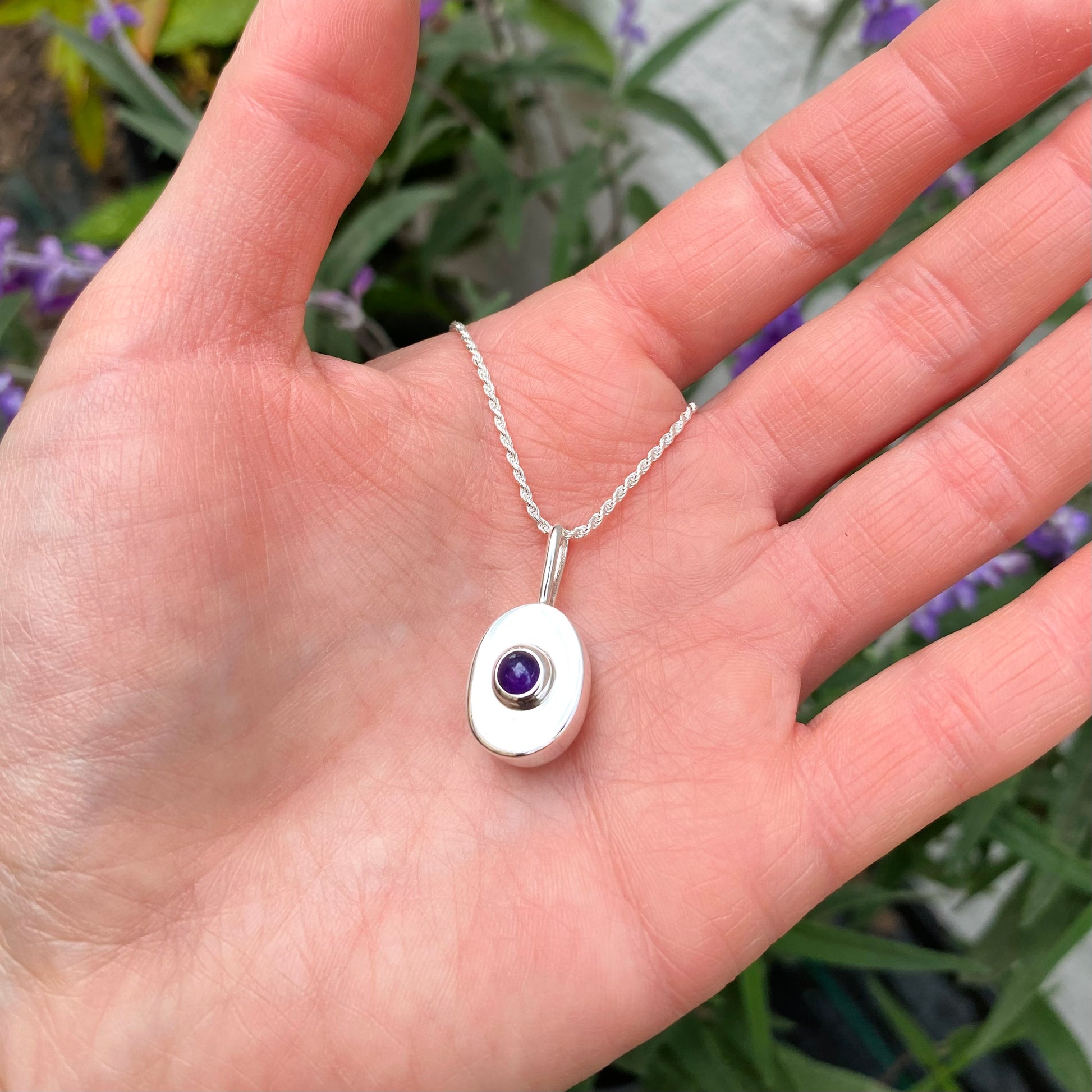 Colgante dos en uno, reversible. Por un lado tiene una piedra en corte cabuchón grande y por el otro una piedra en corte cabuchón pequeña, centrada en una base de plata. Terminación brillante.