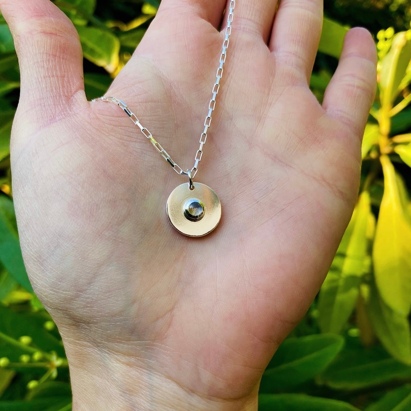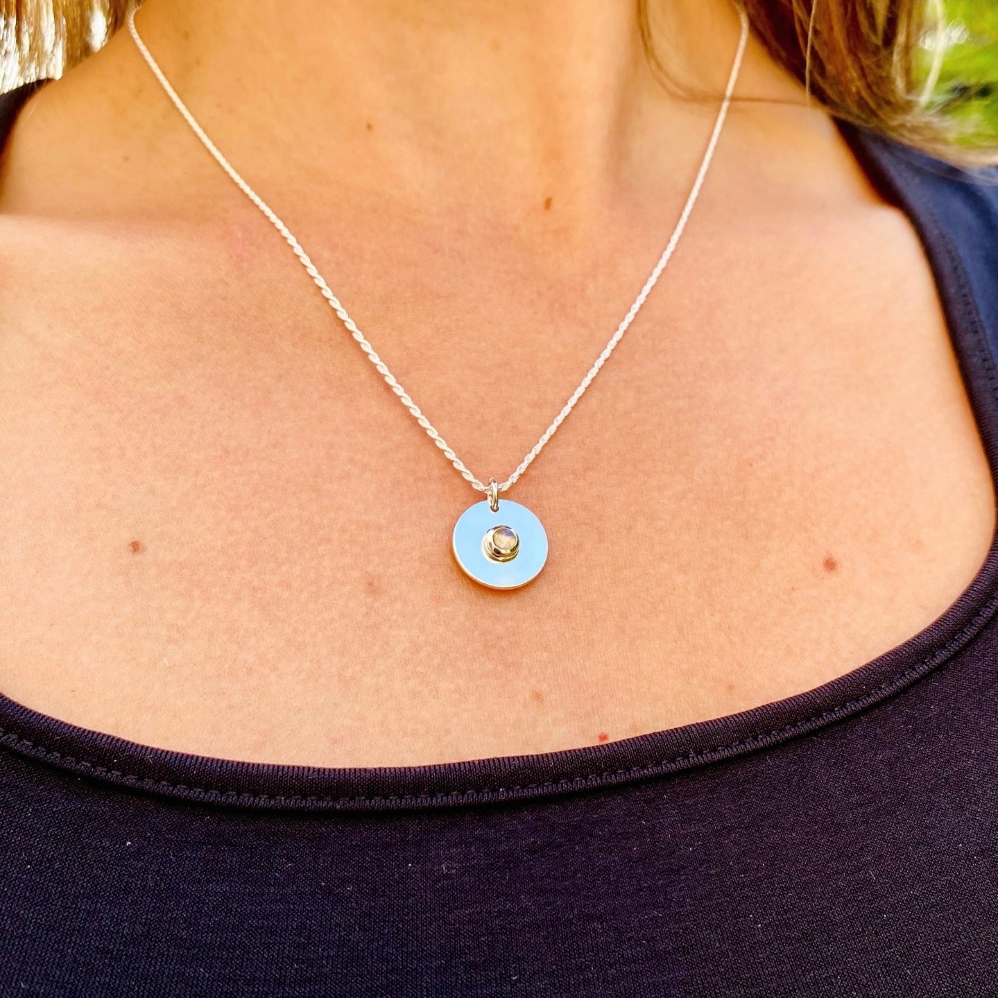 Medalla reversible con letra calada por un lado y piedra luna cabuchón redonda de 4 mm por el otro lado.