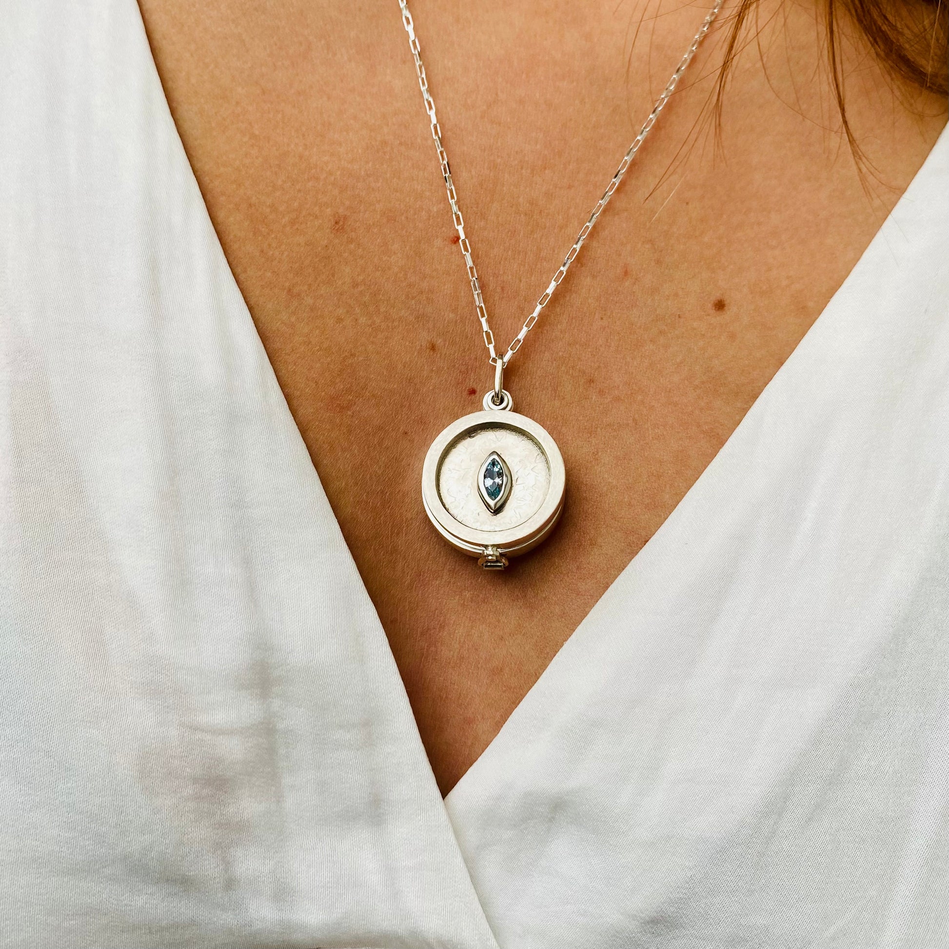 En este relicario puedes guardar una foto u otro pequeño recuerdo. También es posible incluir cenizas selladas con resina u otro objeto sujeto a evaluación.