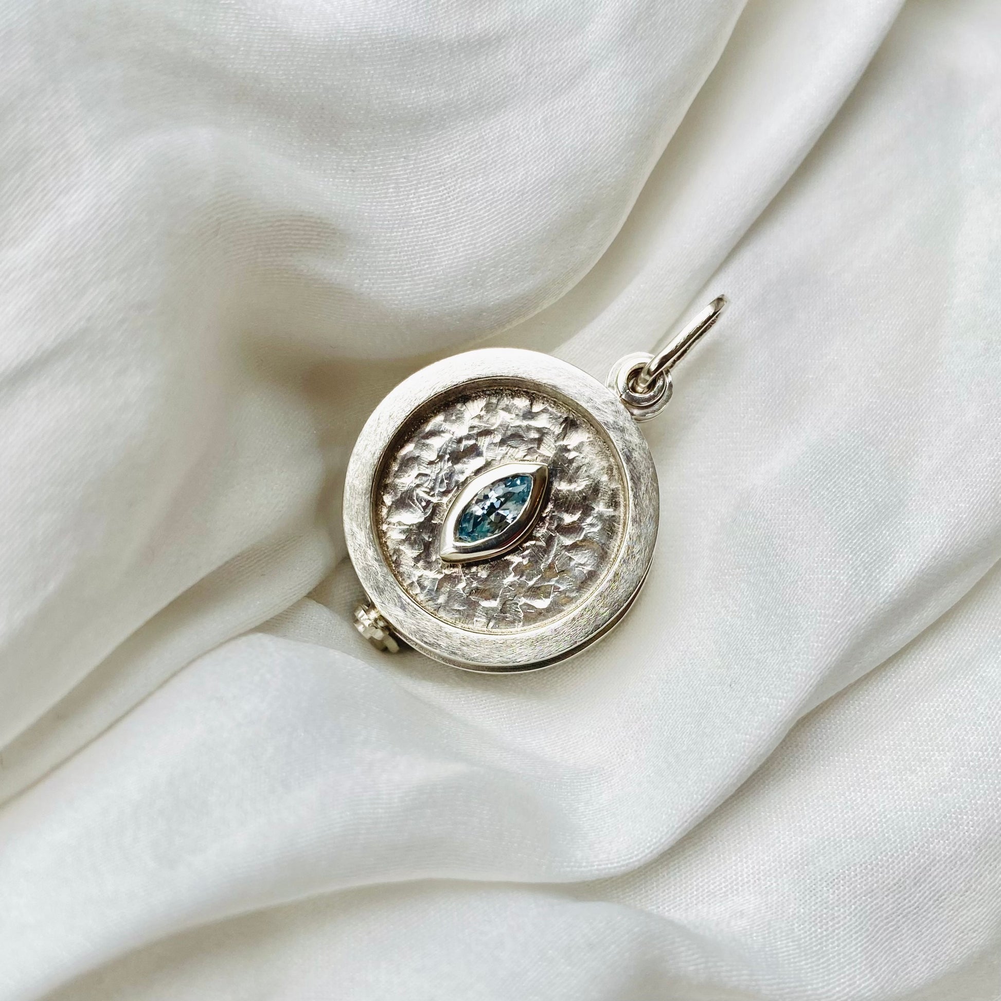 Relicario reversible con piedras naturales topacio aqua blue 7,0 x 3,5 mm corte marquesa y granate 6,0 mm corte brillante.