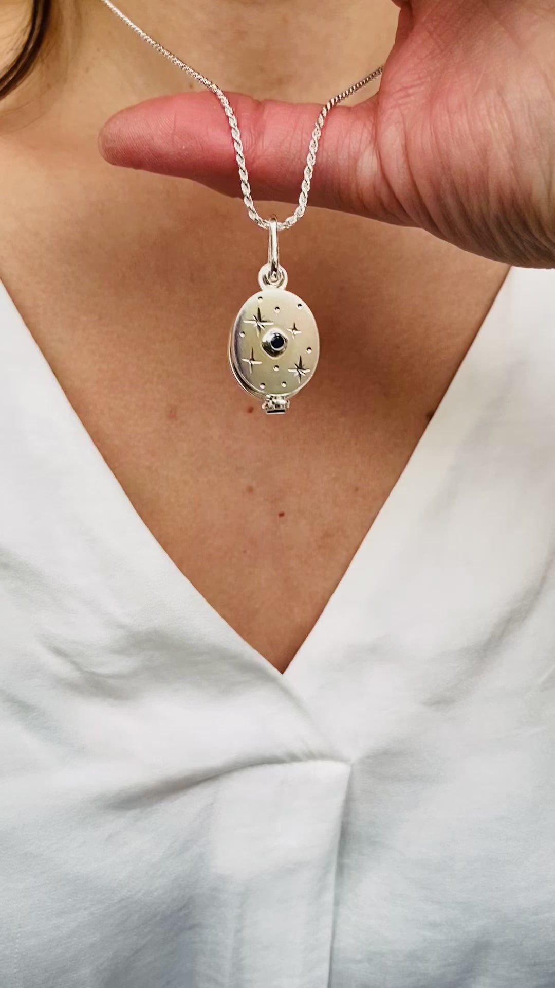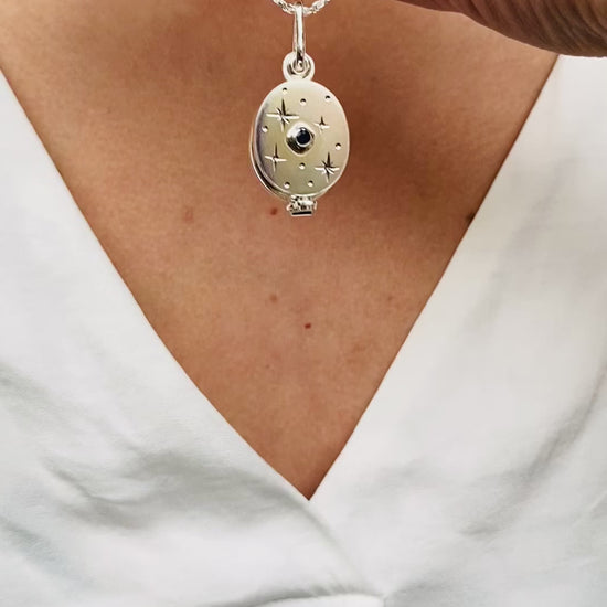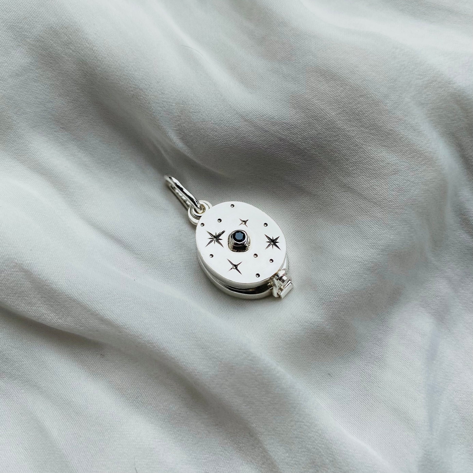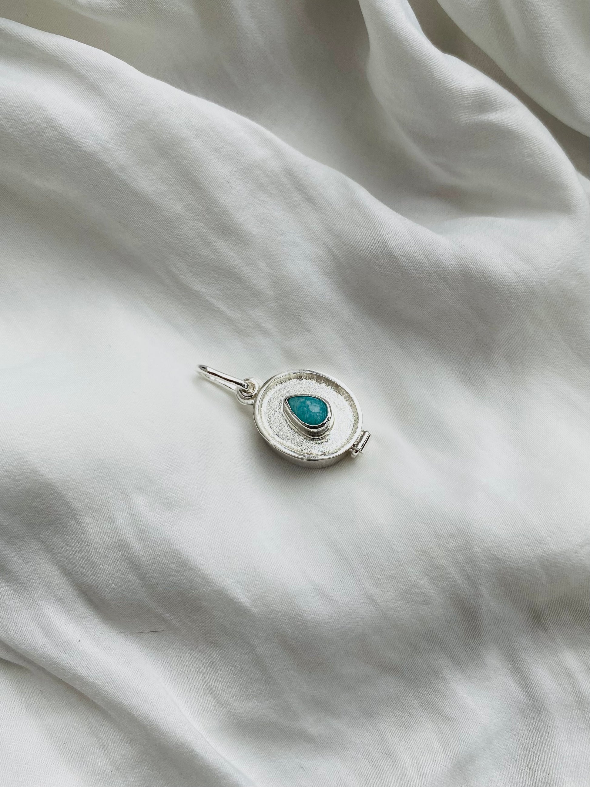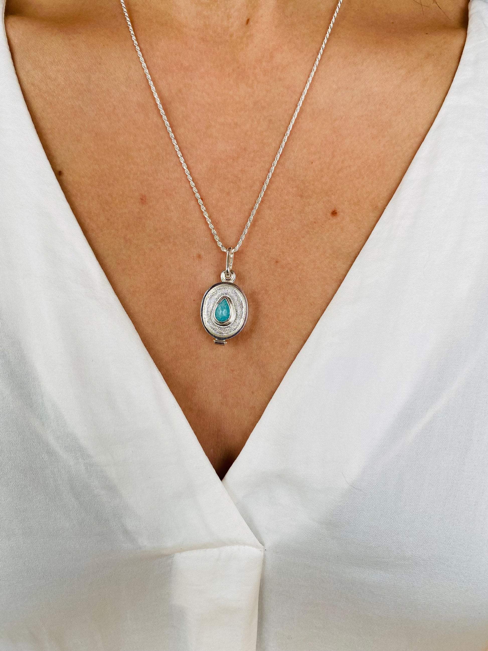 Relicario reversible ovalado con piedras naturales amazonita cabuchón en corte gota y zafiro azul de 2,5 mm en corte brillante.